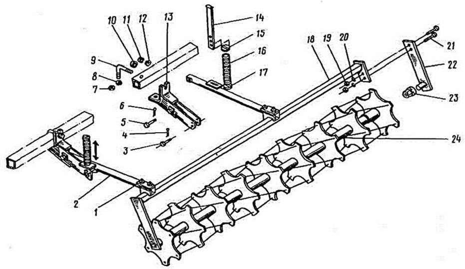 Рисунок 3.12 – Боронка роторная:1 – скоба 2М16?61?115; 2, 22 – тяги; 3 – ось 12?65; 4 – шплинт 3,2?20; 5 – ось 16?75, 6 – шплинт 4,0?25; 7, 12, 19 – гайки М16; 8, 11, 20 – шайбы 16.65Г; 9 – скоба 5М16?115?120; 10 – шайба 16.02; 13 – кронштейн; 14 – штанга нажимная; 15, 17 – колпачок; 16 – пружина, 18 – вага; 21 – болт М16?45; 23 – подшипник; 24 – ротор
