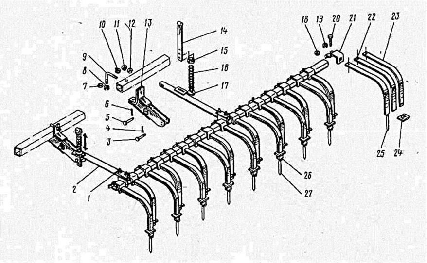 Рисунок 3.13 – Боронка пружинная: 1 – скоба M16?61?95/35, гайка М16, шайба 16.65Г; 2 – тяга; 3 – ось 12?65; 4 – шплинт 3,2?20; 5 – ось 16?75; 6 – шплинт 4,0?25; 7,12 – гайка М16; 8.1 – шайба 16.65Г; 9 – скоба 5М16?115?120/35; 10 – шайба 16.02; 13 – кронштейн; 14 – штанга нажимная; 15, 17 – колпачок; 16 – пружина; 18 – гайка М10; 19 – шайба 10.65Г; 20 – болт М10?30; 21 – скоба; 22, 23 – подпружинник; 24 – хомутик, 25 – зуб; 26, 27 – зуб в сборе