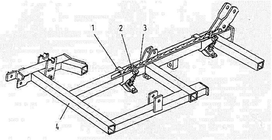 Рисунок 3.14 – Чистик: 1 – кронштейн подвески рабочих органов; 2 – пружина; 3 – чистик; 4 – рама (крыло)