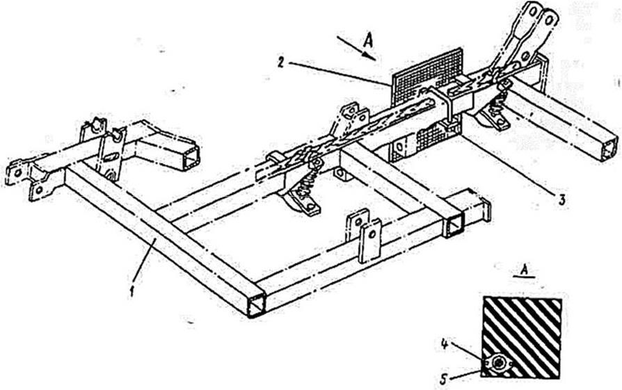 К центральной тяге сницы шарнирно крепится подставка 5 (рисунок 3.5), предназначенная для установки сницы на высоту скобы трактора. В работе и при транспортировании подставка должна быть поднята в положение 1 и зафиксирована замком в положении 2. При отсоединении культиватора от трактора подставку необходимо опустить и зафиксировать замком в положении 5.