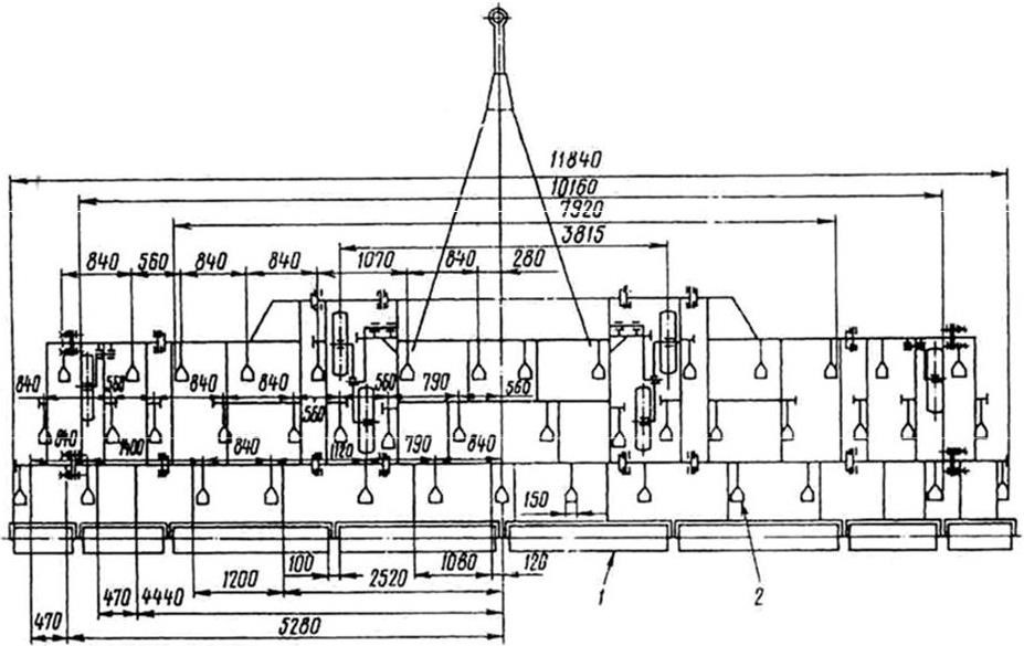 Рисунок 3.17 – Схема расстановки рабочих органов: 1 – боронка роторная; 2 – рабочий орган