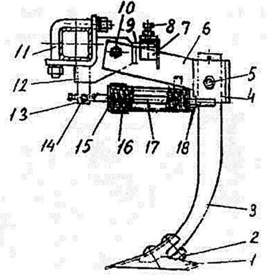 Винтовой механизм для регулировки глубины обработки включает винт 8 с рукояткой 9 и гайку 10, закрепленную на стойке 7. Нижний конец винта закреплен в кронштейне втулки 5. Лапа подпружиненная включает сменные стрельчатую или паровую лапу 1, болты для ее крепления 2, стойку 3, гнездо 4, болт для фиксации стойки 5, кронштейн 6 со стойкой 7 и упорам болтом 8, кронштейн 12 с упорным уголком 9 и стойкой 13, хомут 11 для крепления кронштейна 12 на балке рамы и ось 10 для соединения кронштейнов 6 и 12 (рисунок 5.7). Стойка 13 содержит предохранительную срезную ось .14, на которой закреплена тяга 15 с пружинами 16 и винтами 17. Тяга также закреплена на планке 18.