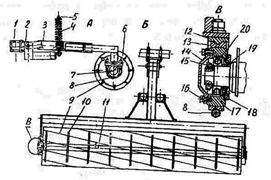 Рисунок 5.9 – Каток планчатый: А – вид сбоку; Б – вид в плане; В – подшипниковый узел: 1, 8 – хомут; 2 – стойка; 3 – рамка; 4 – пружина; 5 – винт; 6 – барабан; 7 – подшипниковый узел; 8 – хомут; 9 – планка; 10 – диск; 11 – вал; 12 – планка; 13 – кольцо; 14 – крышка; 15 – гайка; 16 – болт М8; 17 – корпус; 18 – шайба; 19 – кольцо; 20 – подшипник № 208