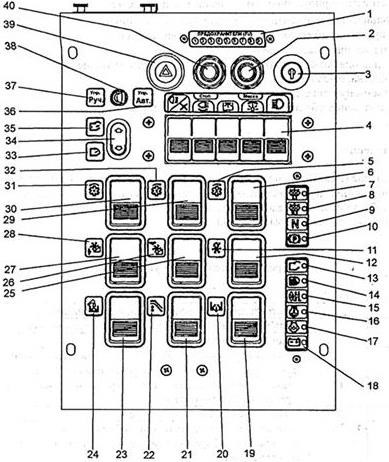 1 – плата светодиодов блока предохранителей; 2 – кнопка «МАССА» 11.3704; 3 – замок зажигания 12.3704-05; 4 – блок клавишных выключателей 53.3710-02.17; 5 – светодиод переключателя вариатора 2-го молотильного барабана; 6 – переключатель вариатора 2-го молотильного барабана; 7 – светодиод включения давления 6,3 МПа; 8 – светодиод включения давления 10,0 МПа; 9 – светодиод включения нейтрали КПП; 10 – светодиод включения стояночного тормоза; 11 – светодиод вариатора мотовила; 12 – переключатель вариатора мотовила П 150-05.17; 13 – светодиод датчика открытия копнителя; 14 – светодиод датчика заполнения копнителя; 15 – светодиод сигнализатора напорного фильтра; 16 – светодиод аварийной температуры воды двигателя; 17 – светодиод аварийного давления масла двигателя; 18 – светодиод разрядки аккумулятора; 19 – переключатель открытия-закрытия гидрозаслонок бункера П 150-05.17; 20 – светодиод переключателя открытия-закрытия гидрозаслонок бункера; 21 – переключатель рабочего-транспортного положения выгрузного шнека П 150-05.17; 22 – светодиод переключателя рабочего-транспортного положения выгрузного шнека; 23 –переключатель включения-отключения выгрузки П 150-05.17; 24 – светодиод переключателя включения-отключения выгрузки; 25 – переключатель гидровыноса мотовила вперед-назад П 150-05.17; 26 – светодиод переключателя гидровыноса мотовила вперед-назад; 27 – переключатель подъема-опускания мотовила П 150-05.17; 28 – светодиод переключателя подъема-опускания мотовила; 29 – переключатель вариатора 1-го молотильного барабана П 150-05.17; 30 – переключатель включения-выключения молотилки П 150-05.17; 31 – светодиод переключателя молотилки; 32 – светодиод переключателя вариатора 1-го молотильного барабана; 33 – светодиод закрытия копнителя; 34 – переключатель открытия-закрытия копнителя 92.3709; 35 – светодиод открытия копнителя; 36 – светодиод автоматического режима работы копнителя; 37 – светодиод ручного режима работы копнителя; 38 – тумблер переключения режимов работы копнителя «РУЧН.» – «АВТ.»кЛЗ-4120; 39 – выключатель аварийной сигнализации 245.3710; 40 – кнопка «СТОП» 11.3704