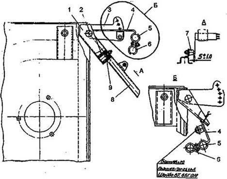 Сигнализатор заполнения копнителя (рисунок 2.49) представляет собой рычажный механизм, состоящий из поворотной штанги 8, на которой закреплены магнит 7 и амортизатор 9, скобы 4 с двумя датчиками 5 и 6, стойки 3, опоры 1 и оси 2.