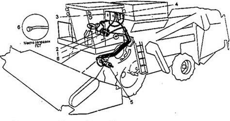1 – гидроцилиндр включения молотилки ГА-93.000-10; 2 – гидроцилиндр вариатора барабана РСМ-10.09.01.010А-03; 3 – гидробак РСМ-10Б.09.09.360 (двигатель СМД-31А) или РСМ-10Б.09.69.010А (двигатели ЯМЗ-238АК и 740.12-210 КамАЗ) или РСМ-10Б.09.69.010А-01 (двигатель Д-461-51АМЗ); 4 – полумуфта наружная Н036.67.100-10; 5 – клапан напорный КН50.12,5; 6 – гидроклапан с электромагнитным управлением КЭ1,6-2,5-16-01; 7 – гидроцилиндр включения выгрузного шнека ГА-93.000-06: 8 – электрогидрораспределитель 4РЭ50-29; 9, 11 – вибраторы ГА–40.000В; 10 – гидроцилиндр поворота выгрузного шнека ГЦ 63.500.16.000; 12,14 – гидроцилиндр закрытия копнителя 54-9-145-06; 13 – гидроцилиндр открытия защелки копнителя ГА 66.010А-03; 15 – гидроцилиндр вариатора вентилятора очистки ЦС 83.000 А; 16 – распределитель копнителя РК 00.000-06; 17 – гидроцилиндр вариатора мотовила ГА-83.ОООА; 18,21 – гидроцилиндр подъема жатки РСМ-10.09.02.100Б; 19 – гидроцилиндр вертикального перемещения мотовила ГА-81.000-08; 20 – гидроцилиндр горизонтального перемещения мотовила ГЦС 32.180.16.ОООА или ЦГС 32.16.000-02; 22 – гидроцилиндр прокрутки жатки ГА 93.000-08; 23 – гидроцилиндр вертикального перемещения мотовила ГА-80.000-03; 24 – гидроцилиндр горизонтального перемещения мотовила ГЦ 40.180.16.ОООА или ЦГ 40.16.000-02; 25 – электрогидрораспределитель 2РЭ50-00; 26 – электрогидрораспределнтель 5РЭ50-44; 27 – насос НШ-32А-3 (двигатель СМД-31А) или НШ-32М-4 (двигатель ЯМЗ-238АК) или НШ-32А-3-Л (двигатель Д461-51АМЗ) или НШ32У-3 (двигатель 740.12-210 КамАЗ); 28 – клапан дросселирующий настраиваемый КДН 00.000-06