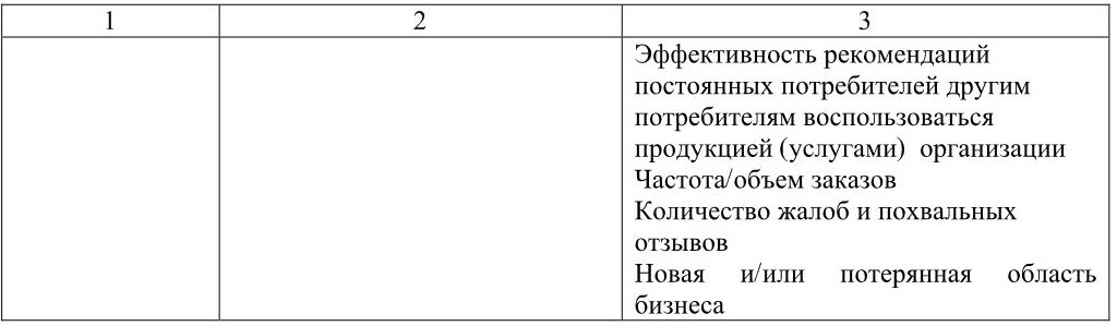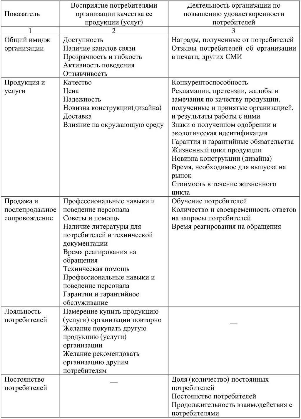 Во второй графе таблицы отражены характеристики исследования восприятия потребителями деятельности организации в целом, ее продукции и услуг, в третьей показаны внутренние характеристики деятельности, используемые для мониторинга, понимания, прогнозирования и совершенствования работы организации по повышению степени удовлетворенности потребителей.