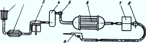 Рис. 3.4. Схема комплекта инструмента для поддувки туш сжатым воздухом: I – фильтр; 2 – бактерицидная установка; 3 – компрессор; 4 – маслоотделитель; 5 – масляный фильтр; 6 – ресивер; 7 – воздухоохладитель; 8 – распределительный коллектор; 9 – пистолет