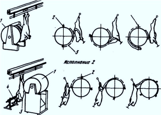 Рис. 3.6. Схема работы установки ФСБ для съемки шкур с туш мелкого рогатого скота 1-барабан; 2- тянущий палец; 3 – цепь; 4 – фиксатор