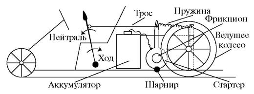 Стартерный двигатель я установил у одного из задних колес, на качающемся рычаге. Вместе с фрикционом двигатель прижимался к колесу пружиной. С аккумуляторной батареей он был соединен несколькими толстыми проводами так, чтобы к нему можно было подключать различное напряжение: 6, 8, 10 и 12 В. Один провод – общий, а другие подключались к клеммам стартера через соответствующие переключатели. Каждому напряжению соответствовал отдельный переключатель. Получилась своеобразная коробка передач.