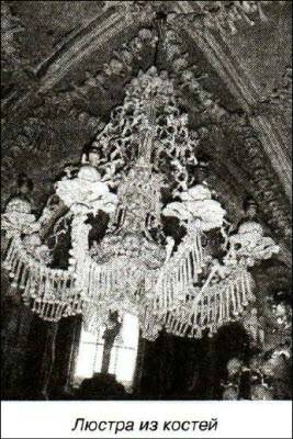 Зрелище человеческих костей, которые используются как декоративный материал, может шокировать даже прожженного циника. Здесь нет пухленьких ангелочков и благообразных старцев, которые принято рисовать на стенах. Вместо них — только черепа и кости, бедренные, лучевые, плечевые и прочие, известные только медикам. Из костей изготовлена значительная часть внутреннего убранства: священная чаша, распятие, кресты и, разумеется, одна из достопримечательностей — грандиозная люстра! Говорят, что при изготовлении этой люстры использовались все кости, которые только есть в человеческом скелете. И черепа, взирающие с высоты на обмерших посетителей, это не что иное, как всего лишь основания для светильников. Кости повсюду, они свисают в виде подвесок, выложены орнаментом, сложены в фигуры. Потолок часовни украшен многочисленными гирляндами в стиле «череп — кость, череп — кость»…