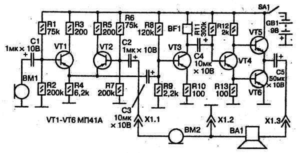 Капсюли ВМ1, ВМ2 и BF1 типа ТОН-1, динамическая головка ВА1 — 0.25ГДШ-2, 0,1ГД-13 или другая с сопротивлением звуковой катушки не менее 50 Ом. Вместо транзисторов МП41А можно использовать современные КТ361А.