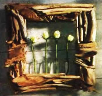 Для начала живописно расположите ветки и закрепите их быстросохнущим клеем на старой раме, переплетите ивовыми прутьями, украсьте корой и древесными сколами, как подскажет воображение. Затем на дощатую поверхность стены внутри бордюра наклейте в ряд полиэтиленовые колечки для пробирок. Остается налить в них воду и поставить в ряд пять, семь роз, гвоздик или левкоев.
