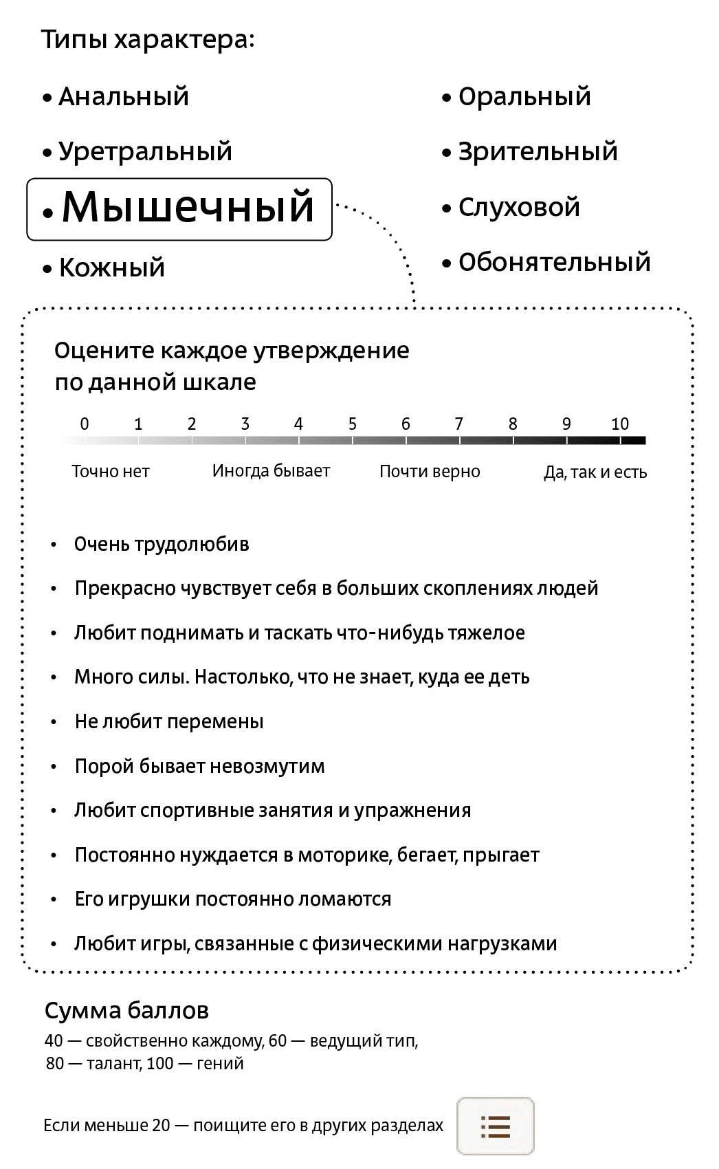 Кстати, уравновешенные «мышечники» обладают уникальной способностью успокаивать психически нездоровых, неуверенных в себе людей. Еще один несомненный дар — это их способность хорошо чувствовать все живое. «Мышечники» словно говорят на одном языке с животными, которые интуитивно тянутся к ним, чувствуя их доброту и спокойный нрав. Именно поэтому очень часто такие люди выбирают профессию ветеринара. В стремлении быть ближе к природе они обзаводятся дачей или «домиком в деревне», где будет возможность побыть на природе, завести живность — и заодно умирать каждые выходные в трудовом энтузиазме, вскапывая или пропалывая грядки.