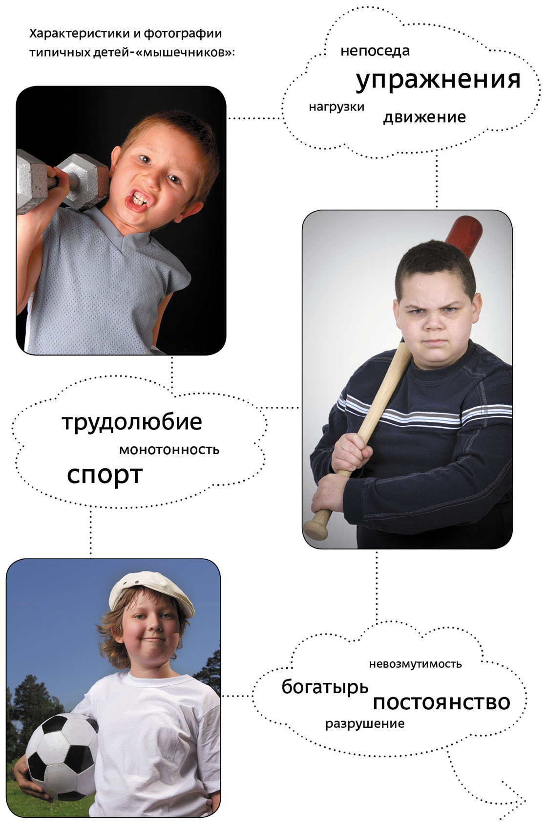 Обладая таким здоровым и крепким телом, «мышечник» не всегда может понять более скромные физиологические потребности других. Если же собственный ребенок вдруг отказывается заниматься спортом, «мышечник» может решить, что «надо просто поднажать посильнее, главное, чтобы слабаком не вырос», не понимая, что этот рецепт — не для всех. Если для него таскание тяжестей — нечто вроде забавы, и «мышечный ребенок» несет в школу портфель, который с трудом может оторвать от земли его папа, слабость и субтильность других понимаются такими людьми с трудом и обычно вызывают у них презрение, смешанное с жалостью. Родителям «мышечника» нужно с детства объяснять своему чаду, что все рождаются с разными физическими данными и что нужно помогать слабым и защищать их. А еще им, родителям, нужно быть готовым к постоянным ссорам на детской площадке, где ваше «мышечное» чадо растопчет куличики из песка, аккуратно выстроенные в ряд «анальником» — не специально, он просто шел к нему познакомиться… Или сломает любимую игрушку соседского мальчика — просто взяв ее в руки. Или случайно в азарте игры ударит своего лучшего друга — так, что у того искры из глаз посыплются…