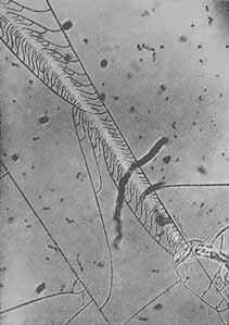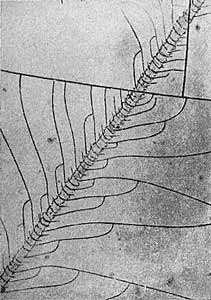 Но уже в 1937 году, то есть еще до того, как в лабораториях появились электронные микроскопы, Андраде и Цинь решили поискать трещины в стекле с помощью простого оптического микроскопа, прибегнув к так называемому декорированию. Этот метод, часто весьма действенный, можно представить себе следующим образом. Пусть тонкая проволока, например телеграфный провод, натянута так далеко от вас, что ее совершенно не видно. Но если бы удалось как-то заманить на нее стаю ласточек, проволока сразу же бросилась бы нам в глаза. (По этой самой причине связисты иногда насаживают пробки на телеграфные провода.) Теперь представьте себе, что появилась новая стая и уселась на спины уже знакомых нам птиц - проволока стала еще заметнее. В принципе таким образом нашу проволоку можно сделать сколь угодно толстой. Теперь остается лишь вспомнить, что некоторые вещества кристаллизуются легче, если на подложке есть какие-то отклонения от регулярности. Выбрав подходящее вещество и заставив его кристаллизоваться на какой-то поверхности, вы часто можете заметить, что новые кристаллы зарождаются почти исключительно на тонких нерегулярностях этой поверхности и, следовательно, делают последние видимыми для наблюдателя.