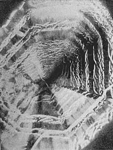 Рис. 19. Трещины вблизи царапины на поверхности стекла (7000).