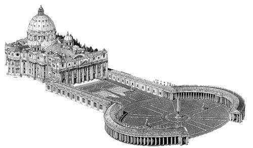 Точно такое же впечатление глубины, возникающее от площади перед собором Св. Петра, объясняется не только грандиозностью ее размеров, но и хитроумными архитектурными приемами. Разведенные, словно руки для объятия, две колоннады с идущими к базилике коридорами, составлены из нескольких рядов колонн, которые постепенно слегка уменьшаются по высоте и чуть-чуть дальше отходят от центра площади. Кроме того, если смотреть на колоннаду из определенных точек, то вместо четырех рядов колонн наблюдатель видит только один ряд, а остальные словно исчезают.