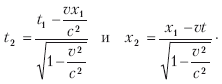 В теории относительности предложены принципиально новые оценки пространственно-временных отношений между физическими объектами. В классической физике при переходе от одной инерциальной системы (№ 1) к другой (№ 2) время остается тем же – t2 = tL а пространственная координата изменяется по уравнению x2 = x1– vt. В теории относительности применяются так называемые преобразования Лоренца: