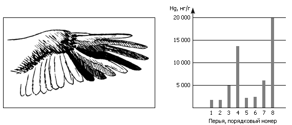 Рис. 10. Различное содержание ртути (представлено густотой штриховки) в маховых перьях скопы Pandion haliaeetus, вернувшейся весной в Швецию после зимовки в Африке. У взрослых птиц перья 1, 2, 5 и 6 (справа налево) вырастают в период зимовки, 3 и 7 — во время перелета и в начале гнездового периода, а 4 и 8 — позднее (когда птица кормится только северной рыбой). Следует, однако, добавить, что проксимальные перья (5, 6, 7 и 8) еще содержат несколько больше ртути, чем соответствующие дистальные перья (1, 2, 3 и 4), — на рисунке это не удалось отразить. Абсолютные величины: самый низкий уровень — около 340 нг/г (перо 1), самый высокий — около 20 000 нг/г (перо 8).