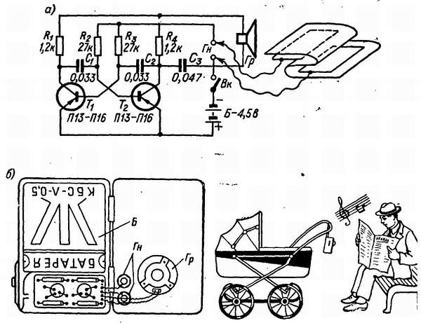Полезную службу мультивибратор может оказать и малышам, если ему поручить роль «няни», предупреждающей родителей о необходимости смены пеленок… Да-да, прибор подает сигнал еще до того, как малыш оповестит об этом своим плачем (рис. 47).