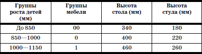 В зависимости от длины тела детей подбирается мебель соответствующей группы. Для определения размера мебели используют антропометрические данные из медицинских карт детей, прибавляя к длине тела 1–1,5 см (каблучок) либо измеряют длину тела ребенка и длину его голени в обуви. Правильная посадка за столом возможна только при соответствии высоты мебели росту малыша. Следует подчеркнуть, что независимо от возраста детей пересмотр соответствия группы мебели длине их тела проводится не реже 2 раз в год. При рассаживании детей учитывается не только рост, но и острота зрения и слуха, склонность к респираторным заболеваниям.