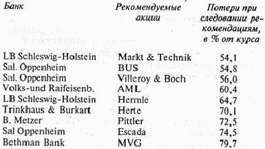 То же относится и к банкам. «Если кто-либо полагает, что можно следовать рекомендациям по покупке акций, которые публикуют банки Германии, ему надо держать ухо востро», – пишет журнал «Менеджер». Ниже приводится таблица, в которой документально представлена судьба некоторых таких рекомендаций. Данные журнала «Менеджер» на период июль 1991 – июнь 1992: