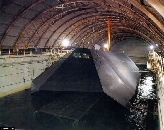 Малозаметный корабль внутри секретного плавучего дока, где производилась его окончательная сборка.(Фото Skunk Works)