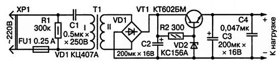 Первичная обмотка сетевого трансформатора подключается к сети переменного тока через гасящий конденсатор С1, а вторичная нагружена на диодный мост VD1. Выпрямленное напряжение с фильтрующего конденсатора С2 поступает на стабилизатор напряжения, выполненный по классической схеме на транзисторе VT1 и стабилитроне VD2. Выходное напряжение дополнительно сглаживается конденсаторами С3 по низкой частоте и С4 — по высокой. Резистор R1 предназначен для разряда гасящего конденсатора после отключения блока питания от электросети. Сопротивление резистора R2 обеспечивает оптимальный ток стабилитрона.