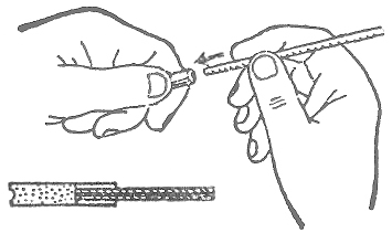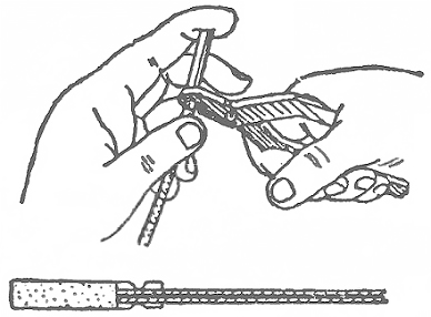 Края трубки приплющивают тихонько щипцами, чтобы она крепче обжимала шнур. Пусть она сидит на нем так прочно, как наконечник на шнуре для ботинок. Все вместе — шнур и капсюль — называют зажигательной трубкой.