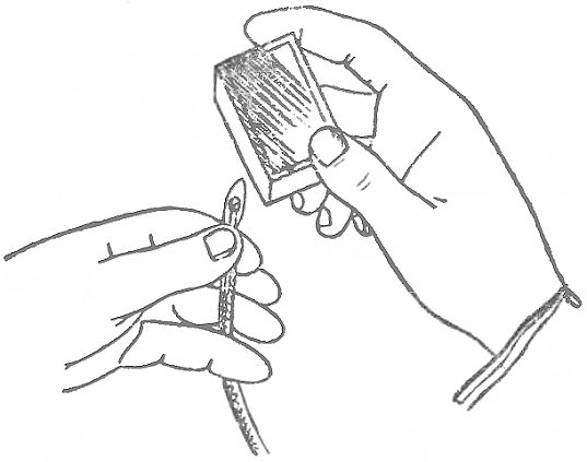 Но сначала срезают другой конец шнура наискось, словно кончик гусиного пера. Пусть побольше обнажится сердцевина. К сердцевине прижимают головку спички. По головке проводят спичечной коробкой.