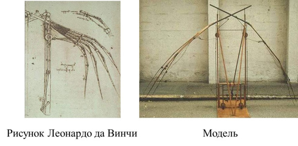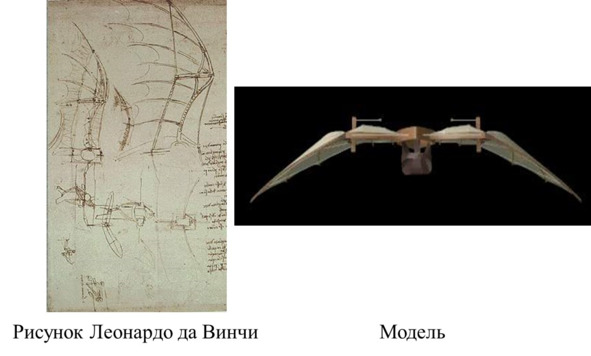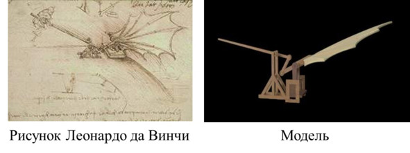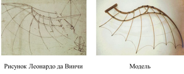 Рисунок Леонардо механизма бьющихся крыльев и его модель