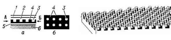 Искусственная кожа – обшивка «ламинфло»: а – боковой разрез; б – срез через слой палочек по линии АБ; 1 – верхний слой; 2 – средний слой; 3 – гибкие палочки среднего слоя; 4 – пространство между палочками, заполоненное демпфирующей жидкостью (черного цвета); 5 – нижний слой; 6 – корпус модели15