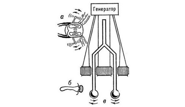 У двукрылых насекомых имеются придатки – жужжальца, которые непрерывно вибрируют вместе с крыльями. При изменении направления полета направление движения жужжалец не меняется, черешок, связывающий их с телом, натягивается, и насекомое получает сигнал об изменении направления полета. На этом принципе построен жиротрон (рис. 1.14) – вильчатый вибратор, обеспечивающий высокую стабилизацию направления полета самолета при больших скоростях. Самолет с жиротроном может быть автоматически выведен из штопора. Полeт насекомых сопровождается малым расходом энергии. Одна из причин этого – особая форма движения крыльев, имеющая вид восьмерки. На рис. 1.14 изображены: а – схема летящей мухи с колеблющимися по обе стороны тела жужжальцами; б – жужжальце; в – схема жиротрона; ток от генератора посылается попеременно то во внешние, то во внутренние электромагниты, что вызывает колебания вильчатого жировибратора16.