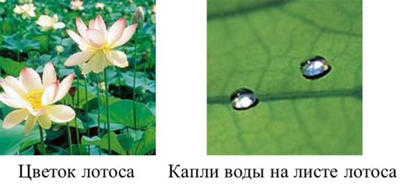 В природе давно подмечен феномен, характерный для листьев цветов лотоса – они никогда не намокают (рис. 1.15а). После дождя или полного погружения в воду они сразу же оказываются сухими и чистыми. На поверхности листьев лотоса вода образует капли, которые, словно шарики ртути, скатываются по поверхности листа, увлекая оказавшиеся на листе инородные частички. Это природное явление получило название «эффекта Лотоса».