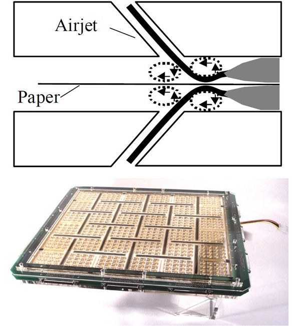 По аналогии с поведением стаи термитов, где каждый термит принимает независимые решения, но при этом стая движется к общей цели, например построению гнезда, в исследовательском центре Xerox в Пало Альто разработали новую технологию подающего механизма для копиров и принтеров, названного AirJet. Печатное устройство оснащено множеством воздушных сопел, каждое из которых действует независимо, без команд центрального процессора, однако в то же время они способствуют выполнению общей задачи – продвижению бумаги. В устройстве отсутствуют подвижные части, что позволяет удешевить производство и делает устройство более надежным. Устройство содержит 144 набора по 4 сопла, направленных в разные стороны, а также 32 тыс. оптических сенсоров и микроконтроллеров (рис. 1.16).