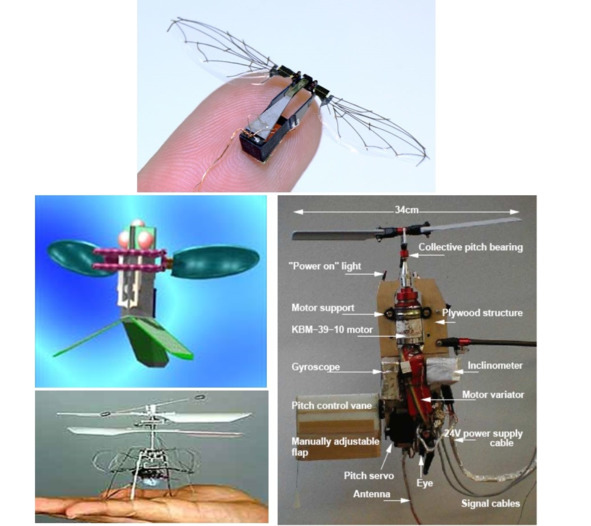 Ученые из Калифорнийского университета в Беркли (University of California at Berkeley) работают над созданием крошечного робота, который имеет массу всего 0,1 грамма. Он может ползать по поверхности и летать (рис. 1.17). Робот имеет миниатюрные полиэстеровые крылья с металлическим каркасом. На крыльях размещены крошечные солнечные батареи. Механический привод позволяет крыльям двигаться со скоростью до 150 махов в секунду: при этом оба крыла могут независимо друг от друга поворачиваться в сторону. Возможная область применения робомухи будет от уничтожения насекомых-вредителей и до промышленного шпионажа. На рис. 1.17 показаны различные конструкции робомух.