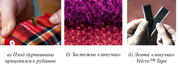 Швейцарский инженер Джордж де Местраль (Georges de Mestral) в 1955 году, гуляя со своей собакой, заметил, что к ее шерсти постоянно прилипают какие-то непонятные растения. Устав постоянно чистить собаку, инженер решил выяснить причину, по которой сорняки прилипают к шерсти. Исследовав феномен, де Местраль определил, что он возможен благодаря маленьким крючкам на плодах дурнишника (так называется этот сорняк). В результате инженер осознал важность сделанного открытия и через восемь лет запатентовал удобную «липучку» Velcro, которая сегодня широко используется при изготовлении одежды. Застежка-«липучка (репейник)» состоит из двух прочных лент, лицевая сторона одной из которых покрыта петлями из полиамидных мононитей, а лицевая сторона второй – петлями из мононитей с боковым разрезом, т. е. крючками (лента петельная и лента крючковая). При соединении двух лент крючки входят в петли, и происходит быстрое и прочное сцепление. Разъединение двух лент требует значительного усилия (рис. 1.18).