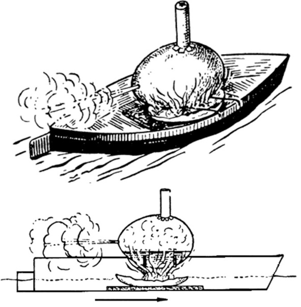 В узком конце яйца осторожно делают маленькое отверстие, из которого выпускают все содержимое. На яйце можно сделать из бумаги трубу для декорации. На дно лодочки кладут кусок пробки, а на нее – часть яичной скорлупы. Наливают в яйцо немного воды так, чтобы она не достигала уровня отверстия. В скорлупу на дне лодки кладут кусок ваты, смоченной спиртом, или кусок сухого спирта. Горение должно быть энергичное, чтобы вода быстро закипела. Как только вода закипит и появится пар, лодочка двинется вперед.