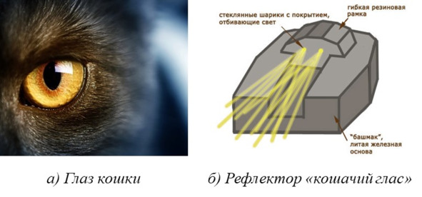 Рефлектор «кошачий глаз» – это устройство для отражения света (отражатель), применяемое на дорогах в опасных местах для обеспечения безопасности движения.