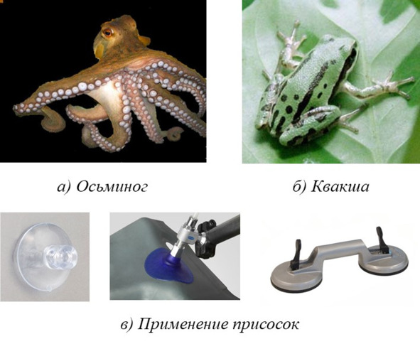 В технике очень много различных применений присосок. Они используются для крепления предметов к гладким поверхностям или переноса, например, стекол. Обувь мойщиков окон высотных зданий оснащена присосками для обеспечения их безопасной фиксации и т. д. (рис. 1.31в).