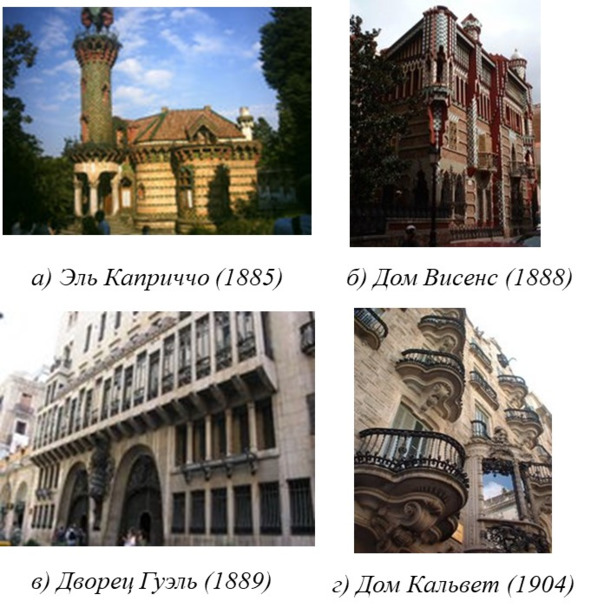 В период раннего творчества, отмеченный влияниями архитектуры Барселоны, а также испанского архитектора Марторела, строятся его первые, богато декорированные, относящиеся к раннему модерну проекты: «стилистические близнецы» – нарядный Дом Висенс (Барселона) и причудливый Эль Каприччо (Комильяс, Кантабрия); также компромиссный псевдобарочный Дом Кальвет (Барселона) – единственное здание, признанное и любимое горожанами при его жизни.