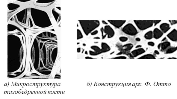 Структура бедренной кости (рис. 1.38а) может послужить образцом для конструирования опор со сложной нагрузкой (рис. 1.38б). Стержни решетки расположены в соответствии с траекториями главных напряжений.
