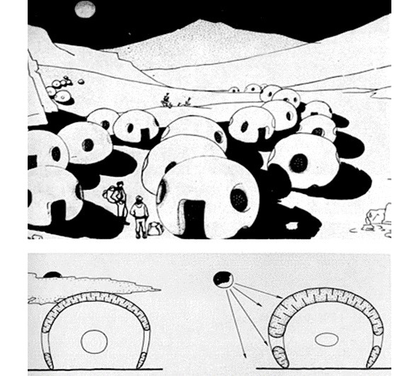 Использование свойства расширения воздуха или каких-либо смесей газов при нагревании создает возможность автоматического регулирования микроклимата в пневматических сооружениях. Эффект увеличения изоляции может дать автоматическое увеличение толщины двухслойного покрытия надувных оболочек при нагреве и уменьшение толщины при охлаждении. Используя эту идею, архитектор Ю. Лебедев предложил проект-идею туристического городка. Надувные палатки, саморегулирующие солнечную радиацию (рис. 1.43). Наверху показан общий вид туристического городка, а внизу – взаимодействие формы и солнечных лучей (разрез палатки)19.