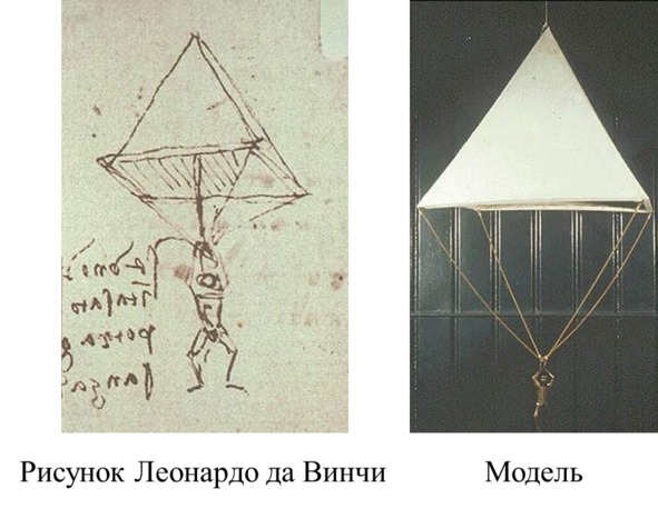 Процитируем высказывания Леонардо об исследованиях спуска человека с большой высоты: «Когда у человека есть шатер из прокрахмаленного полотна, шириной в 12 локтей и вышиной в 12, он сможет бросаться с любой большой высоты без опасности для себя»13.