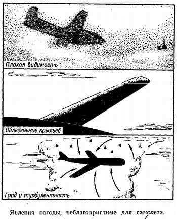 556. С какими специфическими метеорологическими проблемами сталкивается гражданская авиация? Когда пилот авиалинии готовится к полету, его больше всего заботят несколько типов явлений погоды, которые могут создать опасные для полета условия. При взлете и посадке условия видимости и высота облаков учитываются так же тщательно, как и возможность сильных порывов ветра. Во время полета образование льда на плоскостях, лопастях винта, вертикальном и боковом стабилизаторах, заборниках воздуха в двигателе или в карбюраторе — все это в совокупности — может привести к увеличению встречного сопротивления, уменьшению подъемной силы, падению тяги и резкому снижению мощности моторов, т. е. к нарушению нормального полета.