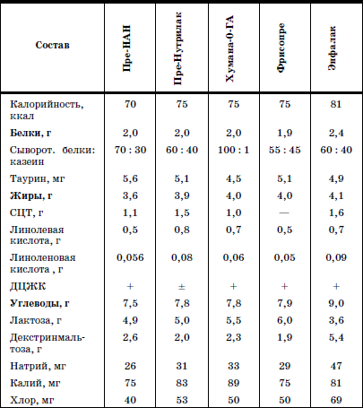 Перевод ребенка на адаптированную молочную смесь проводится постепенно, по достижении им массы 2500 г. В небольшом объеме, при необходимости, специализированная смесь может сохраняться в питании на протяжении нескольких месяцев. Состав отдельных специализированных смесей представлен в табл.3.