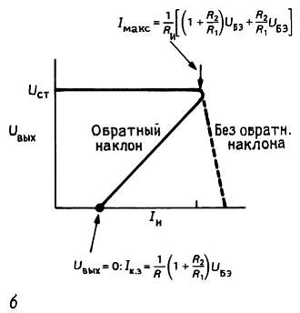 Рис. 6.7. Мощный стабилизатор, снабженный схемой ограничения тока с обратным наклоном характеристики, а — схема; б — зависимость выходного напряжения от тока нагрузки. Iмакс./Iк.з. = 1 + [R2/(R1 + R2)Uст/UБЭ.