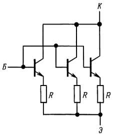 Рис. 6.11. Применение «балластных» эмиттерных резисторов при параллельном включении мощных биполярных транзисторов.
