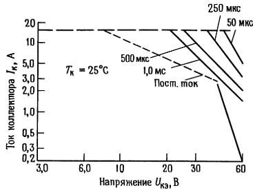 При UКЭ > 10 В лавинный пробой ограничивает постоянный ток коллектора n-р-n-транзистора значениями, соответствующими мощности рассеяния меньшей, чем максимально допустимая паспортная величина 250 Вт. Эта проблема не столь серьезна для коротких импульсов и фактически перестает просматриваться при длительности импульсов менее 1 мс.